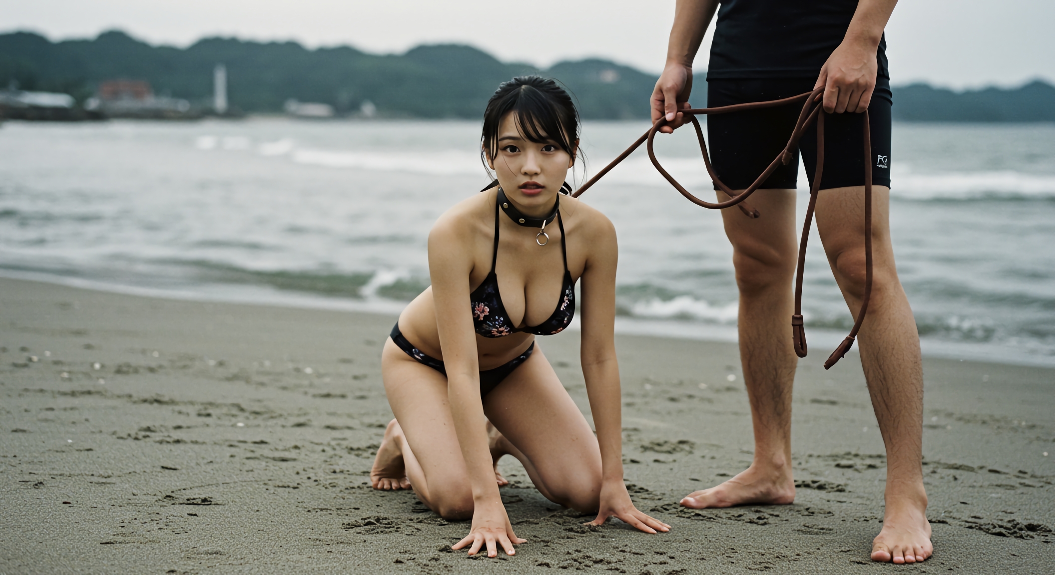 ↑大学3年の美桜 パパと2人きりで旅行中。人気の無いビーチを犬の格好でお散歩中。全裸がいいと言うパパを必死に説得し、なんとかビキニを着せてもらいビーチへ。嫌そうな表情を浮かべていたが、コテージに戻るとまんこはびっしょりと濡れており、そのままパパの汚いちんぽを挿入され中出しされる。